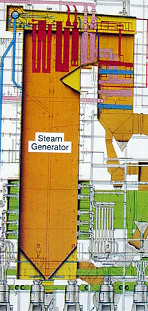 Introduction to a Real Boiler System - continued.Section 1 - continued.d. Notice grayish piping inside the green regions surrounding the lower part of the furnace. This piping is used to transport the pulverized coal from the pulverizers to the furnace burners. The green area surrounding the pulverized coal burners represents the combustion air ducting, designed to accept the combustion air from the FD Fan and introduce it into the furnace. If the figure provided here does not make sense, go back to the block diagram of this system. Much of the technical matter provided here has not been discussed with you. It will be discussed in later sections. This section is designed to provide you with a brief overview. |