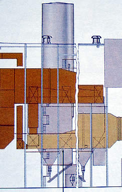 Introduction to a Real Boiler System - continued.Boiler: Section 3This section shows the dry scrubber provided for the system. The purpose of the scrubber is to remove pollutants from the flue gas. Treated flue gas is routed toward right. |