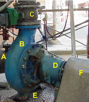 The graphic provided here illustrates an End-Suction (Axial) Frame Mounted pump. This is a very common pump configuration. In the illustration provided the following items are labeled: