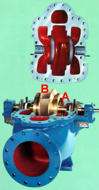 Notice the yellow-golden colored impeller in the pump housing. The suction side of the impeller is indicated by "A". A similar suction side exists on the other side as well. This type of pump is known as a "double suction" pump. The discharge side of the impeller is indicated by "B".