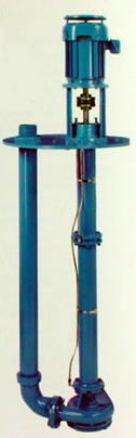 Vertical Centrifugal PumpsThe figure provided here illustrates a vertical mounted centrifugal pump. The pump impeller is connected to the motor by a long vertical shaft. The shaft is housed inside the vertical pipe shown on the right side of the illustration. The vertical pipe shown on the left hand side is the discharge pipe. In many installations the lower part of the assembly (including the pump itself) is submerged in the water. Graphic Source: Goulds Pumps |