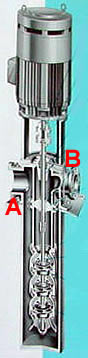 Can Turbine PumpsThe figure provided here illustrates a “Can Turbine Pump”. This is also a type of “line shaft turbine pump.” In this design the pumping column is enclosed in a sealed “can” or vessel. The vessel has two connections. The lower part of the can is connected to the suction side of the pump. This allows the incoming water to come in contact with the pumping unit. The suction inlet is indicated by “A” in the illustration. The upper part of the pump column (not the can) is provided with a pipe which is connected in a “T” formation. This is indicated by “B” in the illustration. The water being discharged flows up inside the pump column and discharges through this connection. Graphic Source: Goulds Pumps |